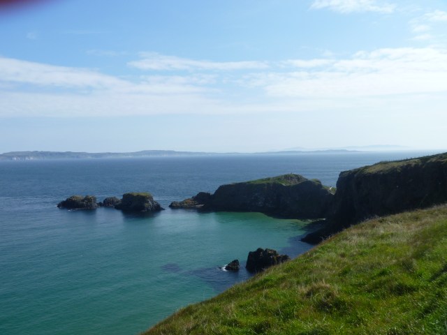 Our first destination was Carrick-a-Rede on the north Antrim coast. From here we had a clear view of Rathlin Island and the Scottish mainland – The Mull of Kintyre. My previous visit to Northern Ireland had been 45 years ago when I spent just over a week at Girl Guide camp at Magilligan Point a beautiful and remote spot on the County Londonderry coast. (Sadly, it became an internment camp and prison during the recent troubles.) From there we visited north Antrim coast and I made my first walk across The Carrick-a-Rede Rope Bridge. Today the whole area is owned by the National Trust. There’s a large car park and cafe-cum-shop and there’s a one mile walk along the coast path from there to reach that wobbly bridge.