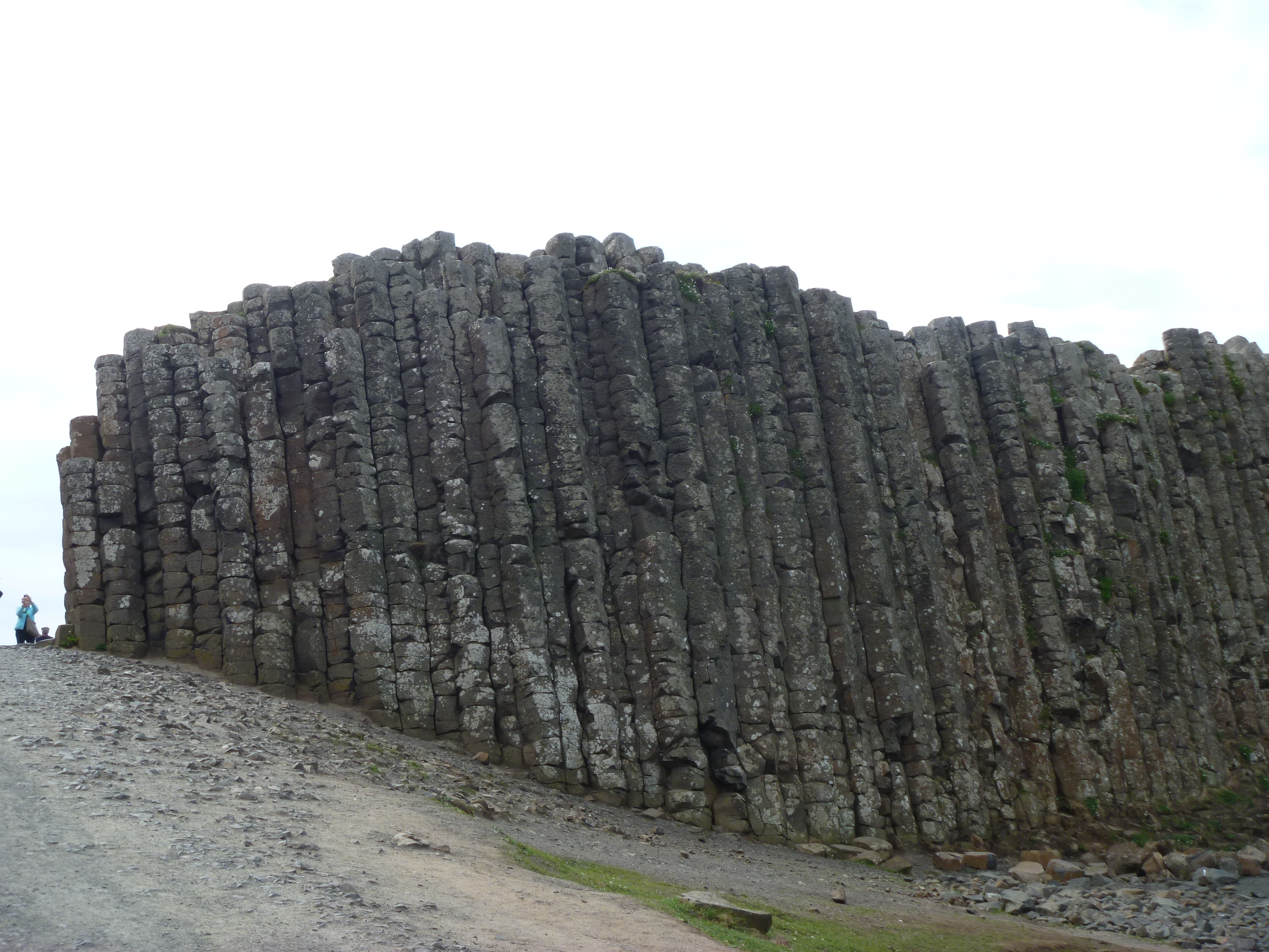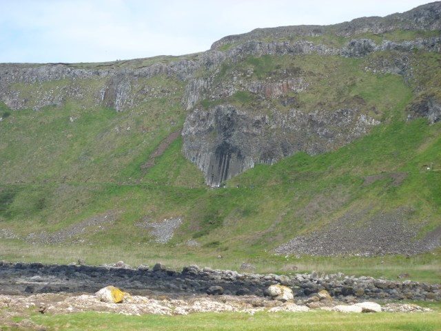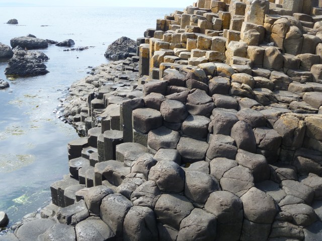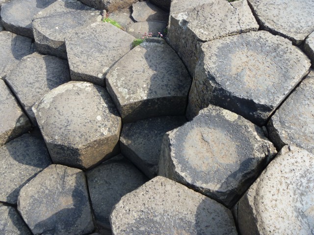 Then it was on to the final stop for the day – the Unesco World Heritage Site of The Giant’s Causeway.The Causeway today is a very busy place. Besides all the visitors, there is a lot of building work going on. The National Trust is building a whole new visitor centre and car park behind the Causeway Hotel where the present shop and facilities are located. For our walk to the Causeway we were accompanied by a volunteer guide who was well-versed in Irish mythology and legends and possibly also in geology and coastal geomorphology. The few facts have been lost amidst the mass of stories connected with Giant Finn MacCool and the unusual rock formations.