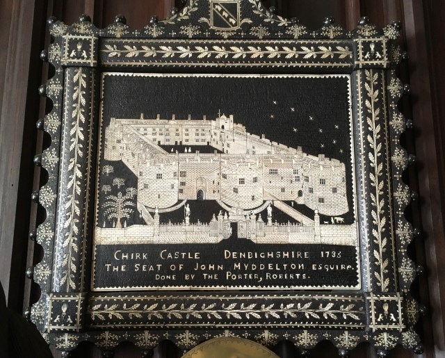 Picture in the Cromwellian Room made of bog oak inlaid with bone. It shows the Castle in 1735 and shows the Davies Gates in their original position.