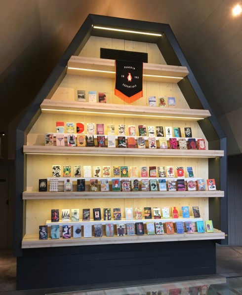 The books covers in the glass display cabinet were familiar to me; not least from the box set of 100 Penguin postcards.