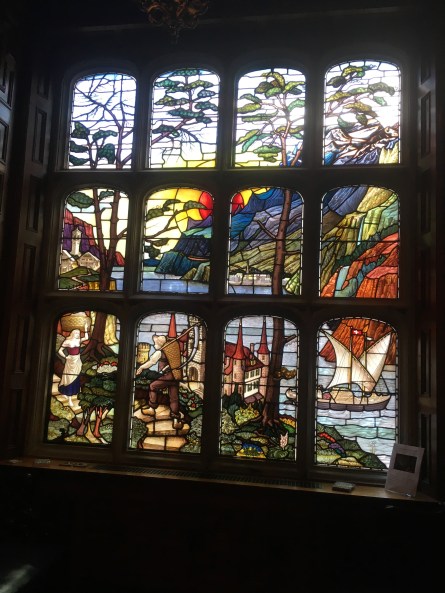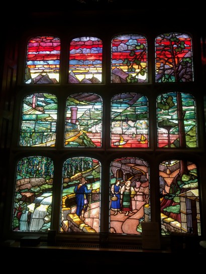 One of two stained glass windows commissioned by William Waldorf Astor reflecting his love of Switzerland. Note the little Swiss flag hoisted on the sailing boat in the little lower right hand panel.