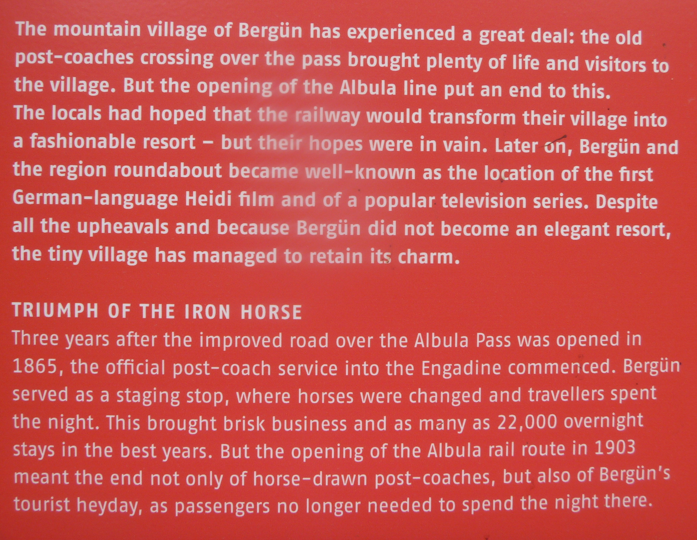 According to the Information Board just outside the village the railway has been a curse and a blessing for Bergün. Back in the nineteenth century the village did a brisk trade in accommodating overnight guests/tourists who were in transit by coach but after the opening of the railway in 1903 it was no longer necessary for horses to be rested and watered here.