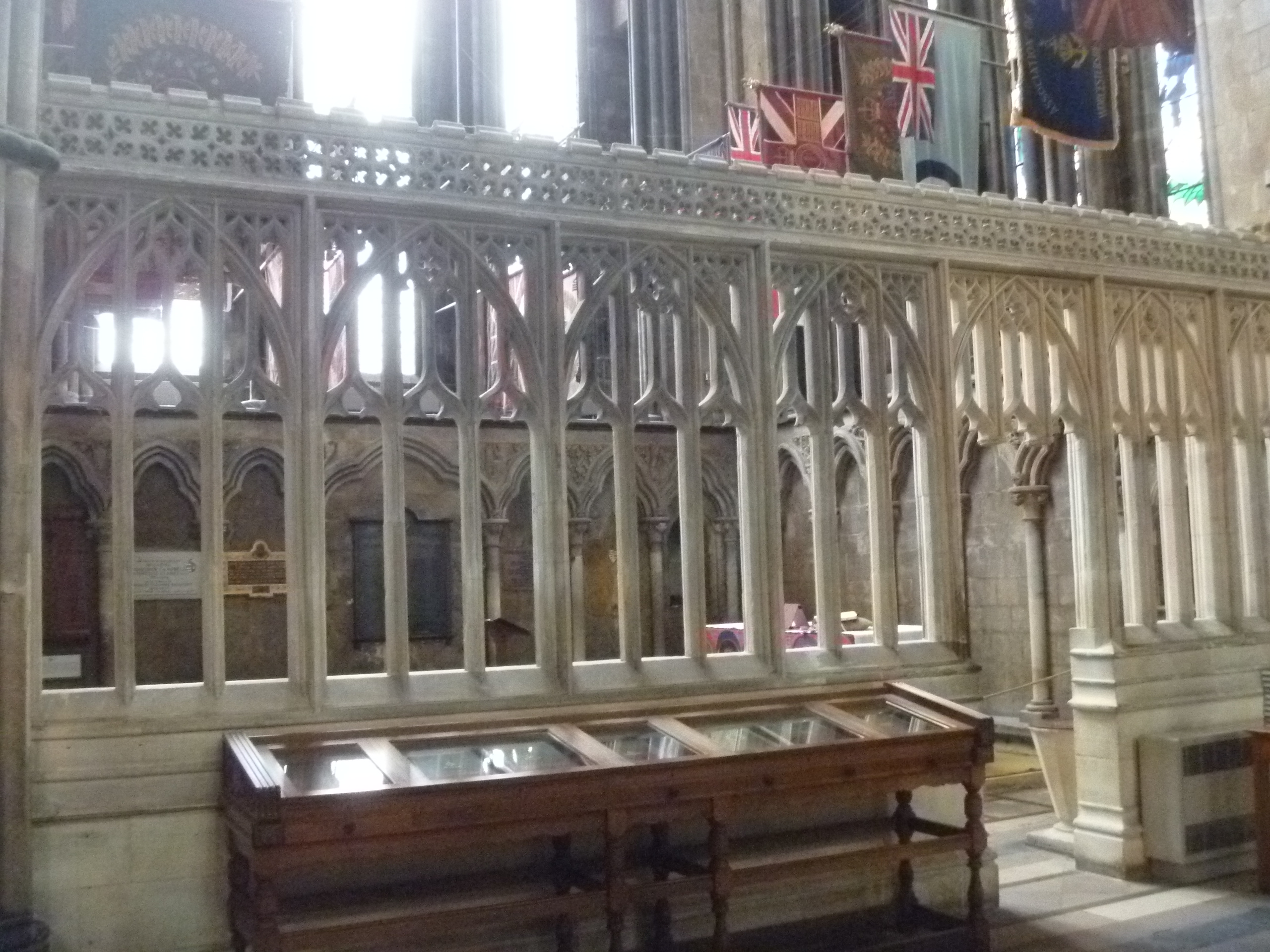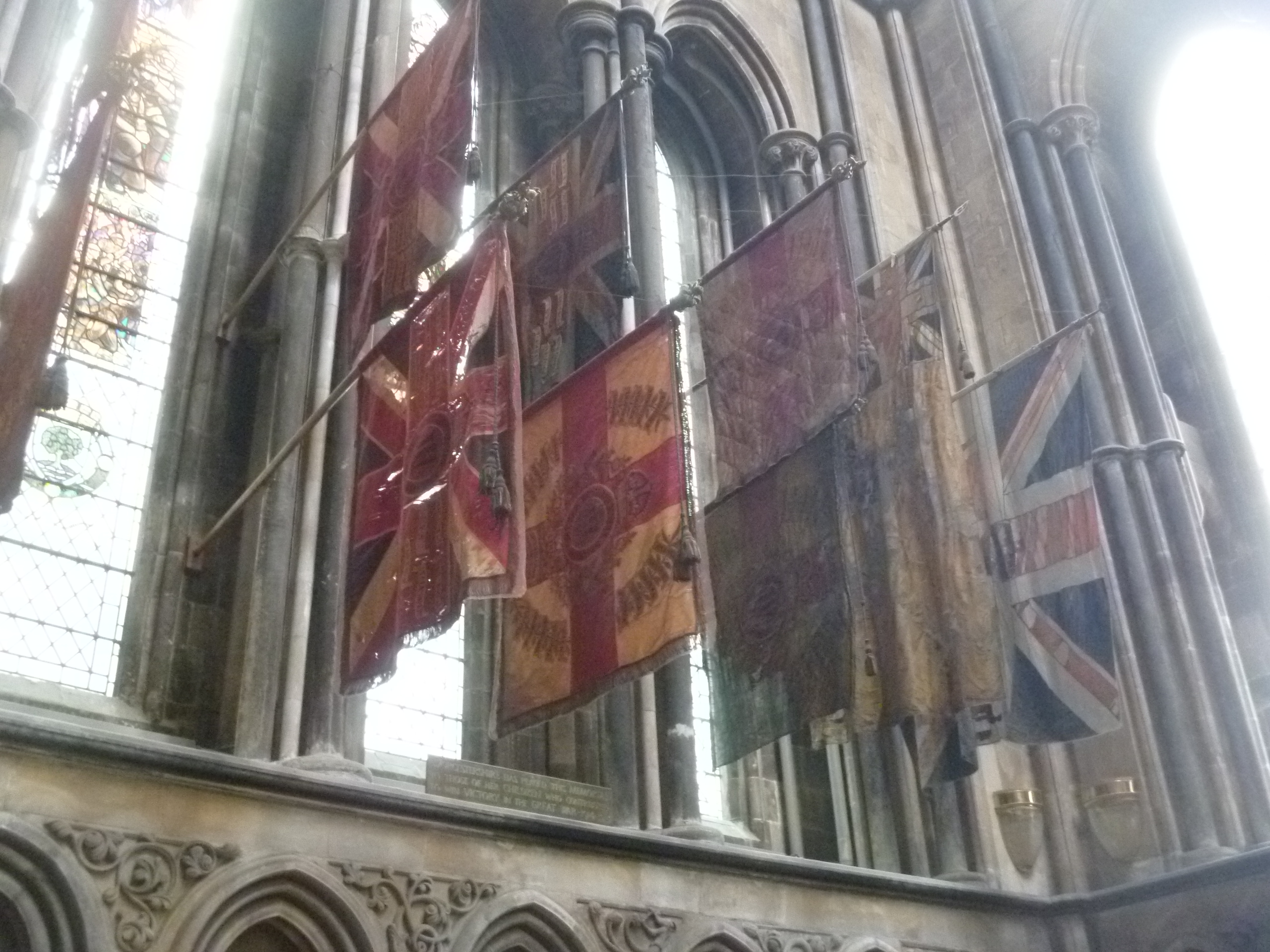 St George’s Chapel, Worcester Cathedral. The Honours Board hangs below the flags.